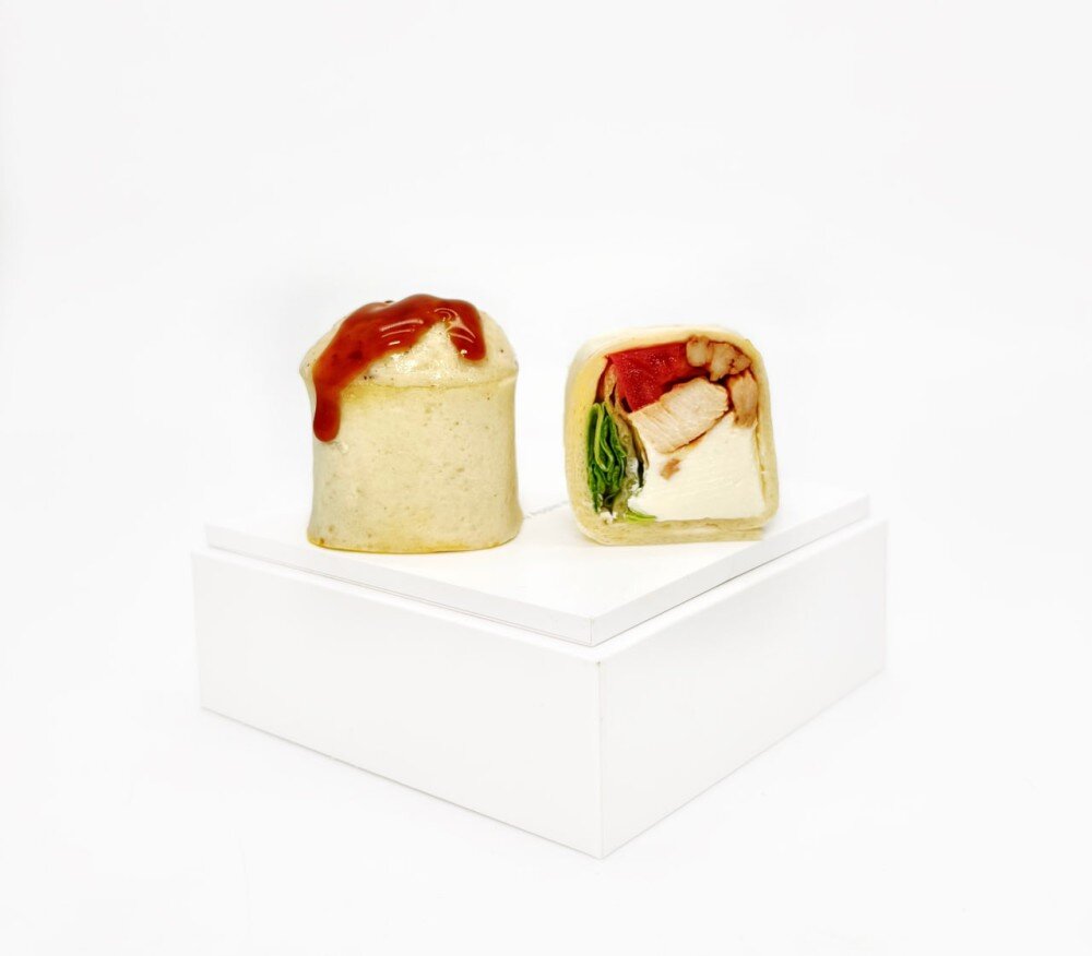 Жаренная курица, тортилья, сыр сливочный, салат айсберг, помидор, фирменный сырный соус, унаги, кунжут.
