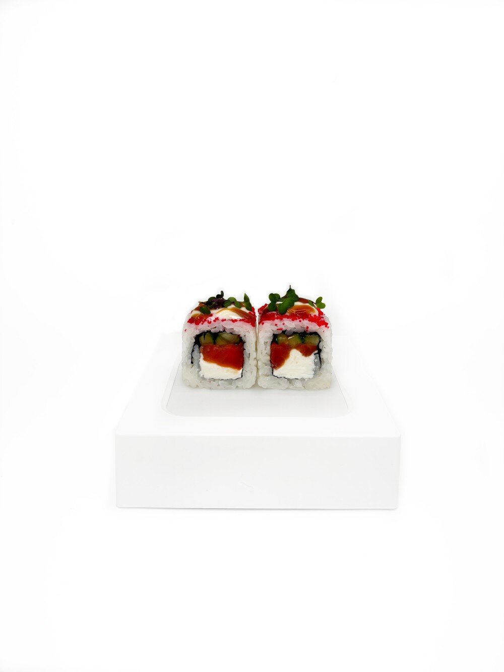 Лосось, сыр сливочный, огурец, масаго красная, унаги, юдзу-майо, микрозелень, рис нори