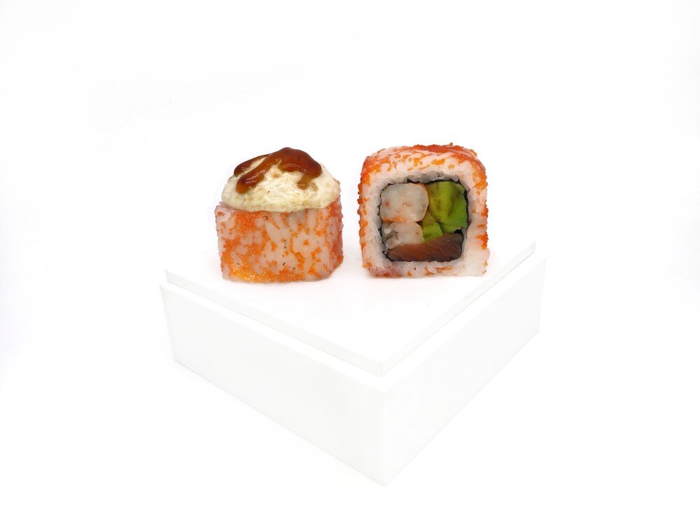 Лосось, креветка, авокадо, икра масаго, фирменный сырный соус, унаги, рис, нори