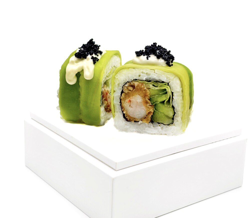 Тигровая креветка в панировке, авокадо, соус юдзу-майо, салат айсберг, огурец, икра масаго, рис, нори