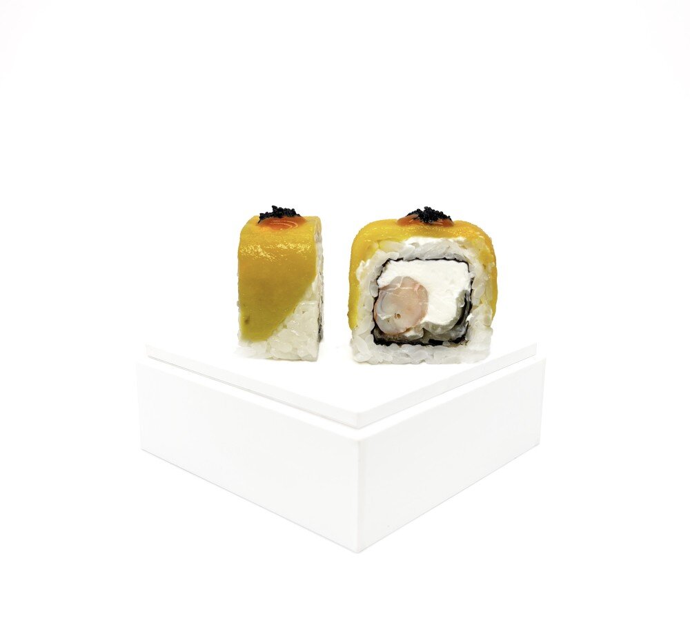 Тигровая креветка, манго, соус манго-чили, сыр сливочный, салат айсберг, икра масаго, рис, нори