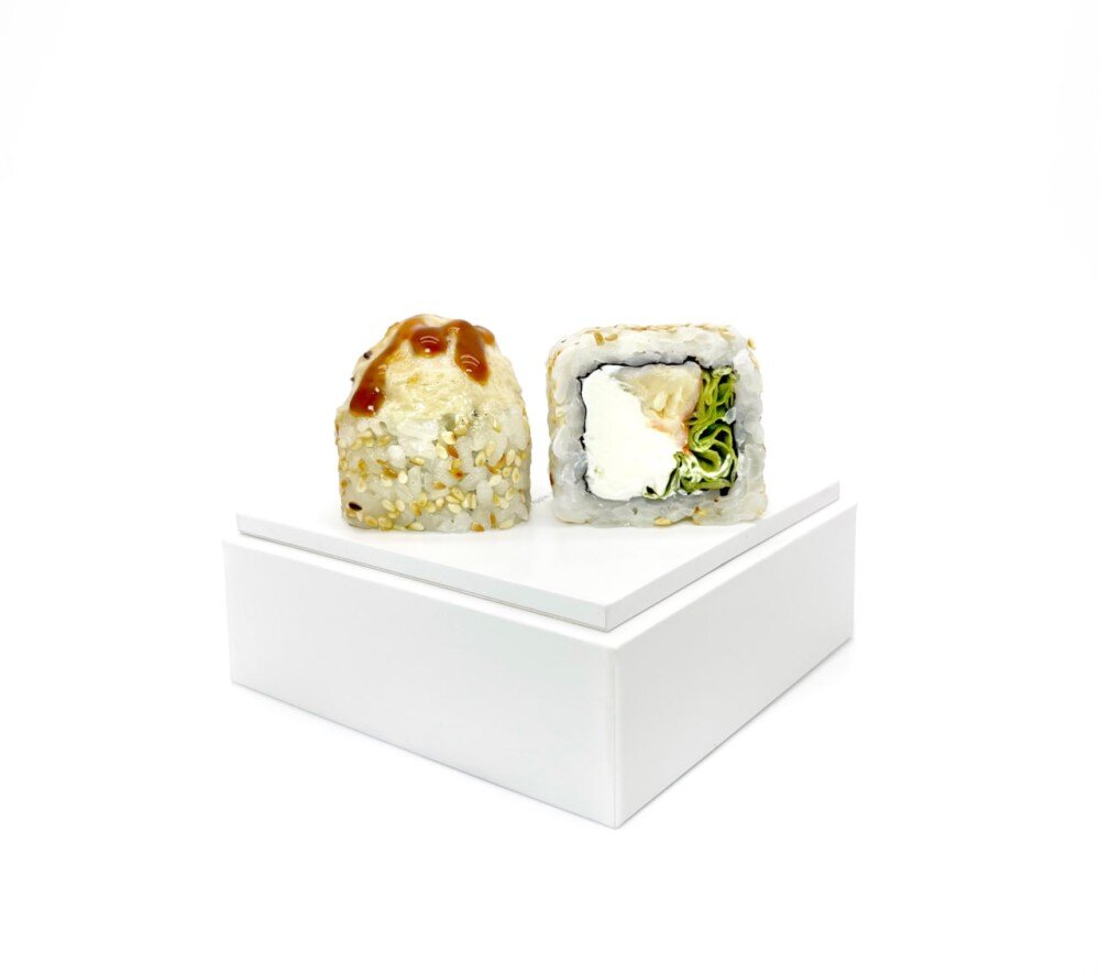Тигровая креветка, сыр сливочный, салат айсберг, фирменный сырный соус, унаги, кунжут, рис, нори.
